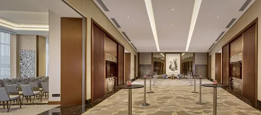 Лобби и холл конференц-центра украшают изящные люстры из множества кристаллов, которые были эксклюзивно созданы для отеля. Они добавляют светлому интерьеру искристой легкости и изящности. Подобные инсталляции можно встретить в залах Дубайской Оперы и в отеле Park Hyatt Zurich.