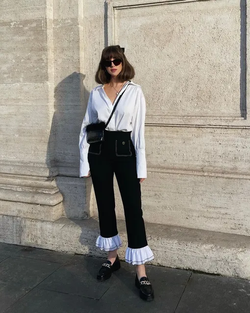 Классическое офисное сочетание «белый верх — черный низ» на самом деле идет на пользу визуальному восприятию фигуры. За счет контрастных оттенков талия выглядит уже — особенно, если низ подобран в более темном оттенке, чем верх. Однако необязательно останавливаться на традиционном монохроме — подобный прием можно использовать и с яркой палитрой.
