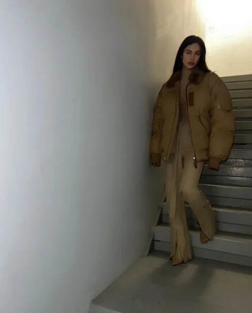 Поверх наряда звезда накинула утепленный бомбер с меховым воротом. В таком вы точно не замерзнете даже самой ранней весной. Хотя бежевый считается нейтральным цветом, сочетание разных оттенков не дают аутфиту казаться скучным, а «невидимая» водолазка добавляет особую изюминку. Отдельное внимание советуем обратить и на брюки. Подобные модели способны визуально вытягивать ноги за счет вертикальных разрезов.