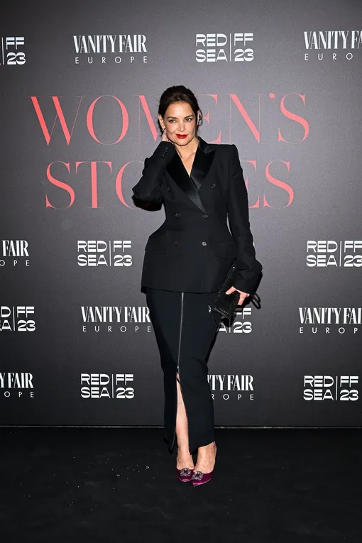 Завершением аутфита стали розовые лодочки, крохотная черная сумка и великолепный бьюти-образ, идеально гармонировавший с нарядом. Стилисты Холмс собрали ее волосы, освободив лишь одну прядь у лица — благодаря этому приему оно начало казаться уже. Также звезде сделали макияж с акцентом на алые губы — мы уже писали, что это беспроигрышный вариант для тотал-блэк нарядов. А длинные и тонкие серьги визуально вытянули шею звезды, добавив всему силуэту женственности и элегантности.