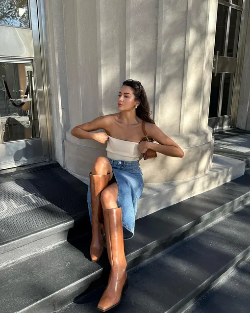 У сапог, которые вы планируете носить с миди, должно быть обтягивающее голенище. Все остальные модели в этом случае не только не подчеркнут стройность ваших ног, но визуально добавят им объема. Лучше приберегите их для комбинации с мини. С джинсовой миди отлично сочетаются ботфорты и любые другие облегающие варианты.
