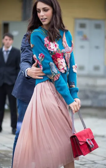 Одно из самых женственных и популярных сочетаний нынешней осени. Юбка из нежной, но фактурной ткани требует в образе не менее фактурных аксессуаров. В комплект идеально впишутся ботильоны из бархата или замши. Модели из гладкой кожи тоже имеют место быть, но тогда стоит компенсировать «глубину» при помощи оттенков.