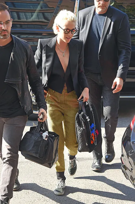 Кристен Стюарт надевает кеды с брюками в клетку, которые заканчиваются внизу трикотажными манжетами. Костюмную нотку поддерживает и расстегнутый короткий жакет,из-под которого виднеется черный жилет, надетый на голое тело.