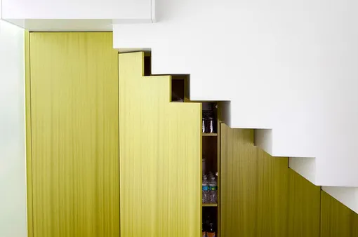 Если в твоем доме есть лестница, то она также может выполнять функцию шкафа со множеством полочек и выдвижных ящиков.
