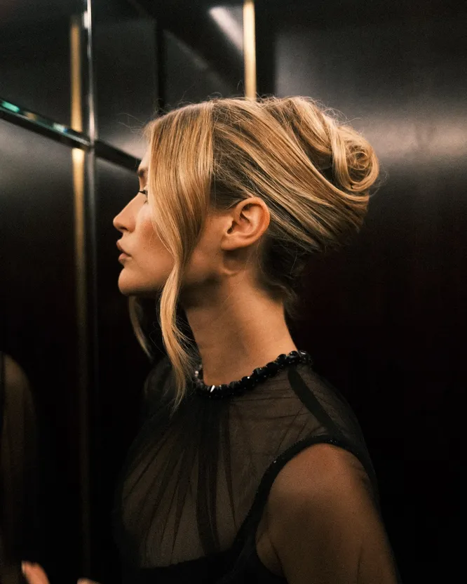 Гладкие укладки были ключевым трендом весь 2025 год и сохранят актуальность в 2026-м. Единственное, что сейчас поменялось, — пробор. Если раньше доминировал прямой, то сегодня в приоритете боковой. Чтобы повторить прическу, нанесите на волосы фиксирующий гель, матовую пасту или пену, распределяя средство от корней к кончикам расческой с частыми зубьями. Выбившиеся прядки уложите позже гелем для бровей или восковым карандашом. Затем соберите шевелюру на затылке в тугой хвост, скрутите длину в плотный жгут и сверните его в «улитку». Альтернатива — разделить локоны на две части, переплести их друг с другом и затем сформировать пучок. Можно оставить и классический хвост, но для этого варианта волосы стоит предварительно выпрямить. В завершение нанесите немного сияющей сыворотки.