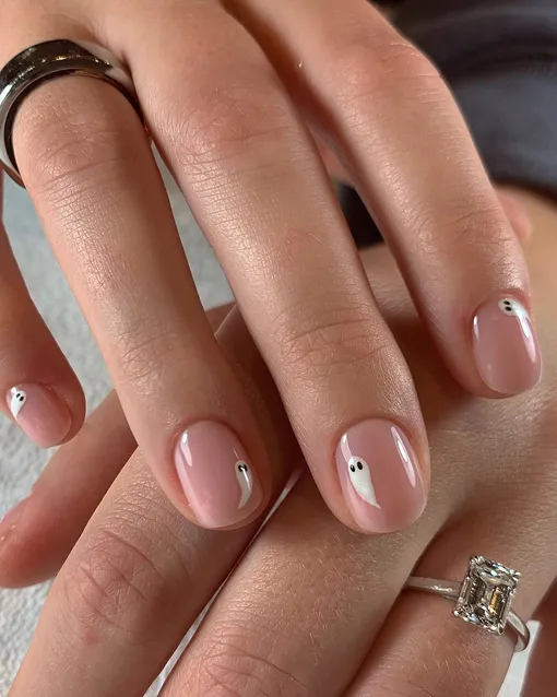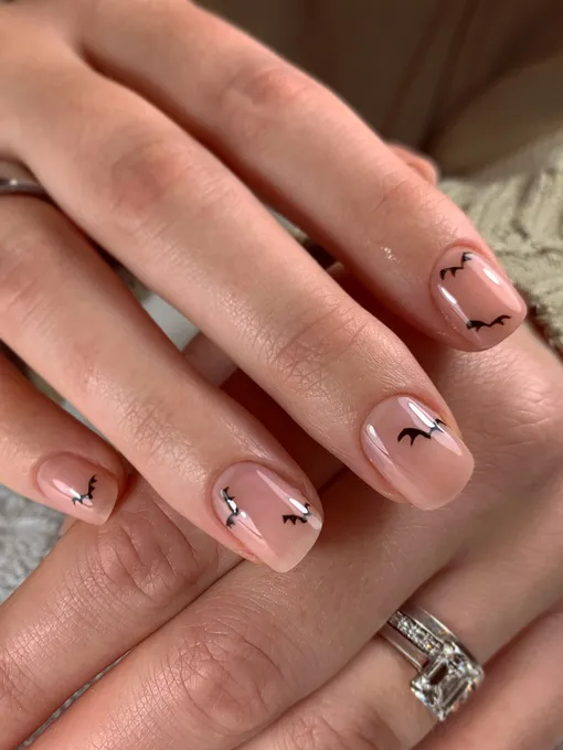 Любительницам лаконичных дизайнов советуем присмотреться к нейл-артам с крошечными рисунками на полупрозрачном или нюдовом фоне. Это может быть как изображение маленького призрака, так и летучие мыши — еще один символ Хэллоуина.