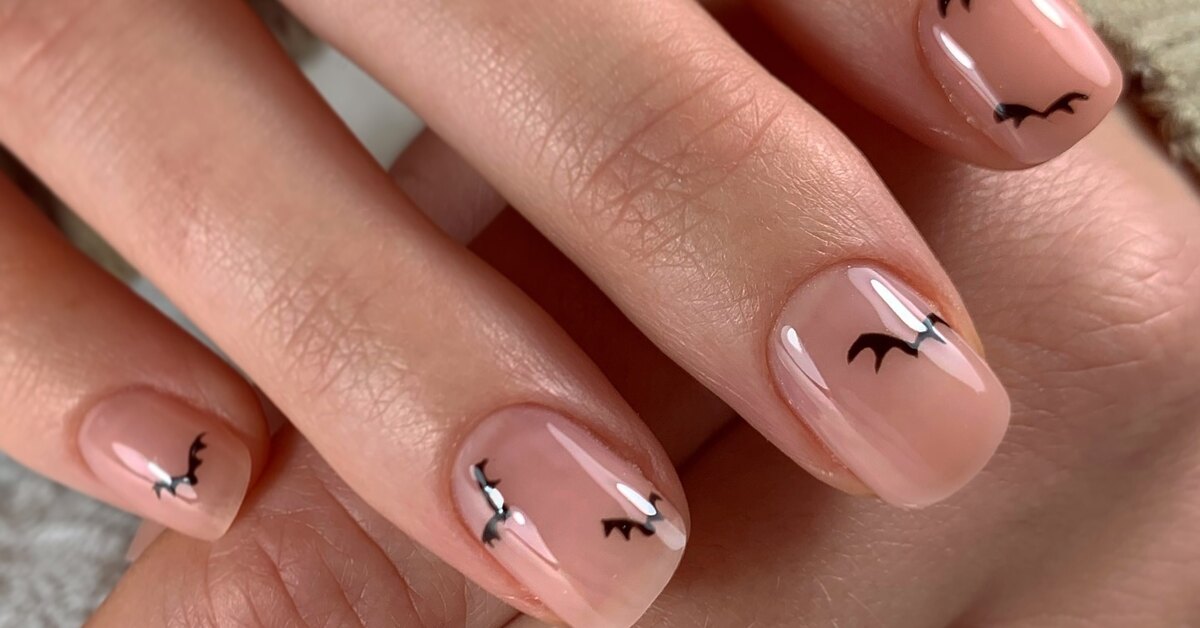 Любительницам лаконичных дизайнов советуем присмотреться к нейл-артам с крошечными рисунками на полупрозрачном или нюдовом фоне. Это может быть как изображение маленького призрака, так и летучие мыши — еще один символ Хэллоуина.