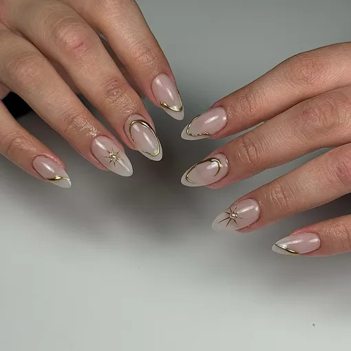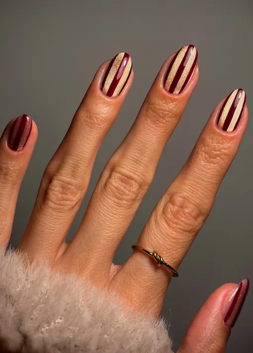 В этом сезоне нам очень нравятся абстрактные дизайны с узорами, выполненными золотом. Это могут быть как кривые линии, так и рисунки с добавлением более новогодних элементов — например, звездами. И не забывайте о существовании фольги для ногтей — она тоже набирает популярность в последнее время. Располагать ее можно как на одном ногте, так и исключительно на его части — у свободного края или, наоборот, возле кутикулы.