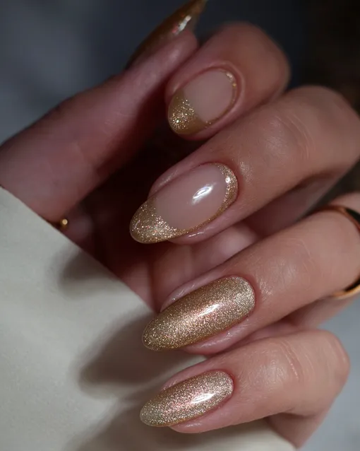 Естественно, один из наиболее актуальных вариантов — золотой металлик. Но он куда меньше ассоциируется с новым годом, чем лак с крупным золотым шиммером. Вы можете полностью покрасить им ногти, а можете сделать френч или даже дизайн с оттяжкой цвета — последний смотрится празднично, но за счет наличия нейтральной базы, более универсально.