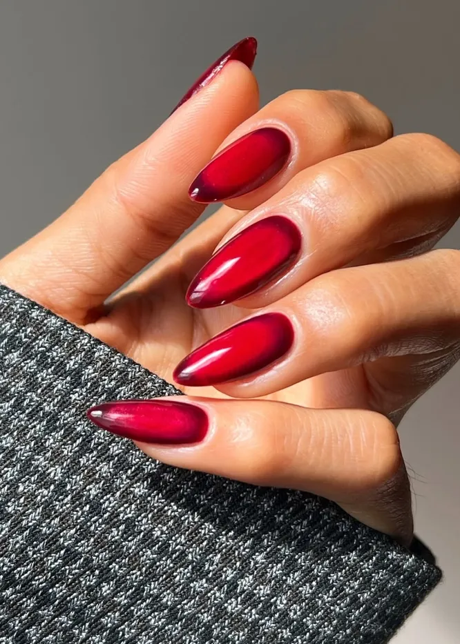 Безоговорочным фаворитом сезона становится красный во всем его многообразии — от пламенного алого до благородного гранатового. Как главный цвет Огненной Лошади, покровительницы года, он сулит смелые начинания и уверенность в себе. Этот оттенок самодостаточен в монохроме, но для праздничного акцента попросите мастера добавить сияющую втирку. Или выберите гипнотический вариант с эффектом «кошачьего глаза».