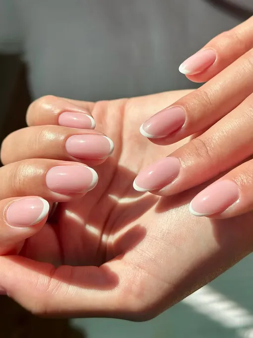 Конечно же, не стоит забывать про френч. Но подойдет далеко не любой. Например, мы не рекомендуем делать слишком широкий френч или рифмовать его с чересчур длинными ногтями. К слову, мы в целом советуем обратить внимание на среднюю или короткую длину ногтей, а также классические формы — овал, мягкий квадрат и миндаль.
