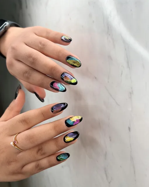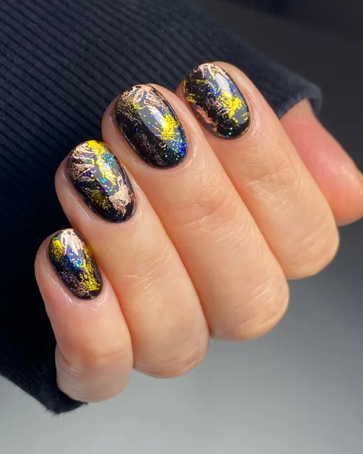 Более праздничные варианты включают в себя яркий дизайн на ногтях. Мы советуем присмотреться к тем, которые выполнены на черном фоне — они выглядят словно фейерверки в ночном небе. Выполнить подобные можно как с помощью фольги, так и рисуя абстрактные узоры разными насыщенными оттенками. А сделать дизайн ярче позволит магнитная втирка.