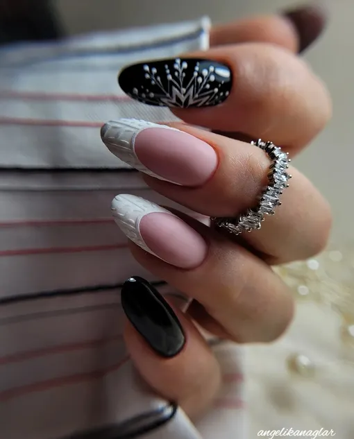 Еще один вариант, который кажется оригинальным лично нам, — матовый черный с глянцевым рисунком. Такой будет круто смотреться на разной длине ногтей, поскольку рисунки могут быть достаточно лаконичными — все зависит исключительно от вашей фантазии.