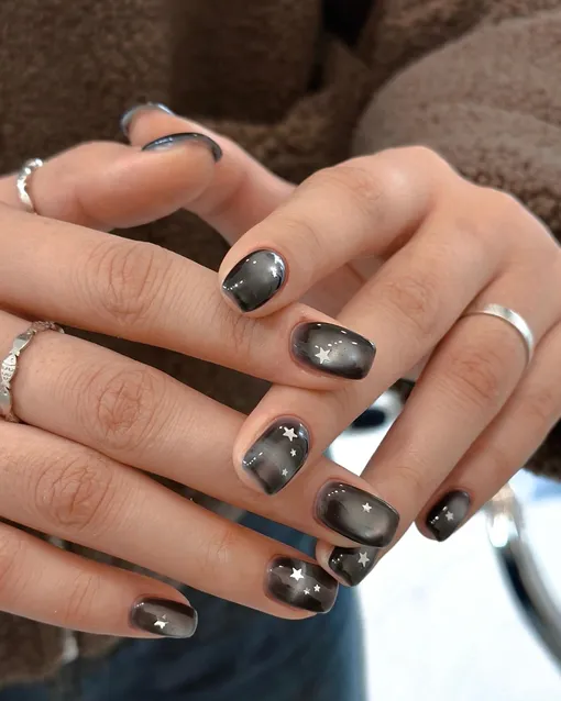 Корейские мастерицы явно полюбили черный в сочетании с трендовым «кошачьим глазом» — еще один дизайн, который можно смело брать на вооружение. Перелив делает черный менее контрастным, уводя его ближе к нейтральному серому, за счет чего такой дизайн будет смотреться празднично в Новый год, но при этом останется актуальным и после завершения сезона вечеринок и корпоративов.