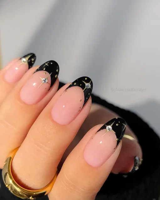 Один из самых популярных вариантов использования черного на ногтях — френч. Добавьте к нему крошечные узоры или, например, стразы, тогда весь дизайн будет смотреться достаточно празднично, но все еще лаконично, не перетягивая на себя лишнее внимание. Изучая блоги, мы отметили популярность френча с оттяжкой — такая вариация тоже имеет место быть, но, чтобы сделать ее праздничной, вам точно не обойтись без глиттера или блесток.