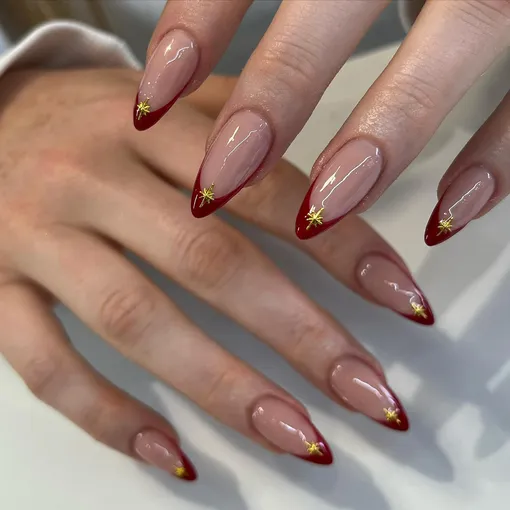 В первую очередь, конечно, можно присмотреться к минималистичным дизайнам. Нам особенно нравятся различные варианты френча или двойного френча. Например, когда основная часть свободного края — красная, а золотой выступает в качестве обводки или небольшого рисунка перед переходом.