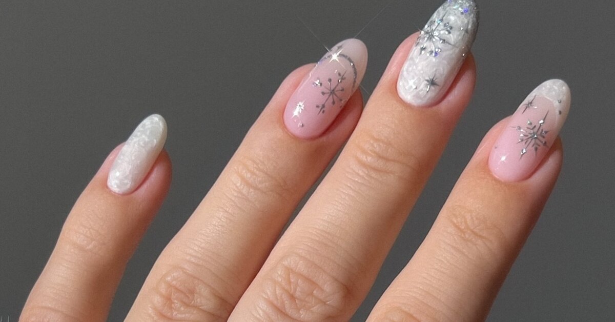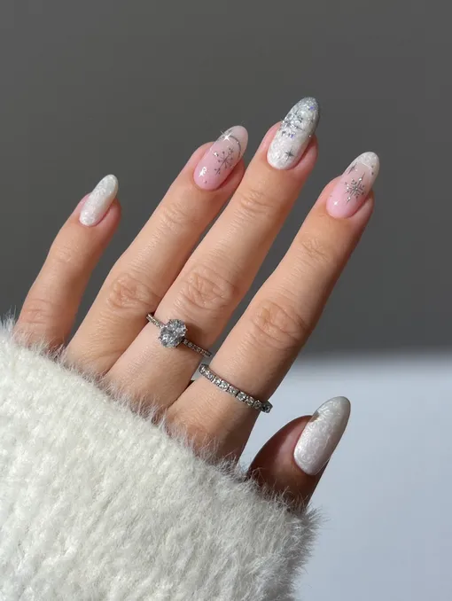 Среди декора и дизайнов мы заметили закономерную популярность снежинок — они могут быть более или менее лаконичными. Однако, помимо этого, актуальными остаются различные варианты глиттера, а еще не забывайте про стразы и золотую фольгу.