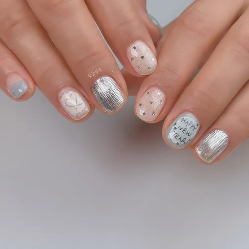 Еще один интересный вариант, который нам очень нравится — разноцветные ногти. Их можно дополнить самыми разными узорами — от трендового гороха, до крошечных снежинок. Но может просто выбрать лак для ногтей с блестящим эффектом, как на фото — такой маникюр вы сможете повторить вообще без мастера, а выглядит он достаточно лаконично и празднично за счет отсутствия чересчур ярких цветов.