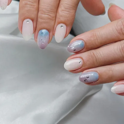 Во-первых, обратите внимание на светло-голубые оттенки — именно они больше всего ассоциируются с зимним временем года. А в сочетании с узором снежинок, шиммером или звездами он станет менее скучным. Еще один трендовый способ разнообразить однотон — сделать «кошачий глаз». А еще нежно-голубой отлично рифмуется с серебристым, и это можно использовать.