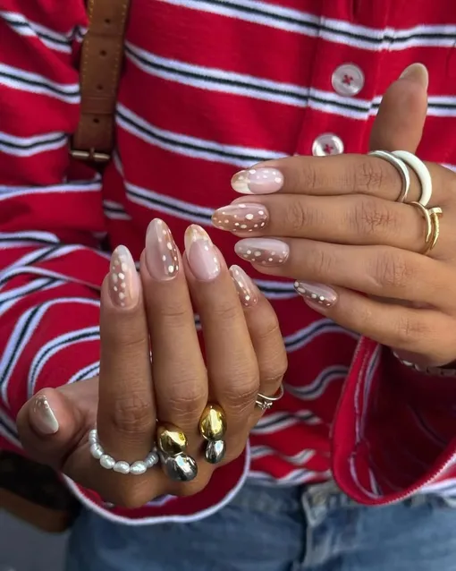 Этот маникюр добавляет нотку невинности и сказочности, которой не добиться с классическим френчем или красным лаком. К тому же издалека подобный дизайн смотрится как спокойный нюд — он не кричит о себе. А если контраст с белыми пятнами кажется вам чересчур насыщенным, просто попросите выполнить дизайн полупрозрачным лаком.
