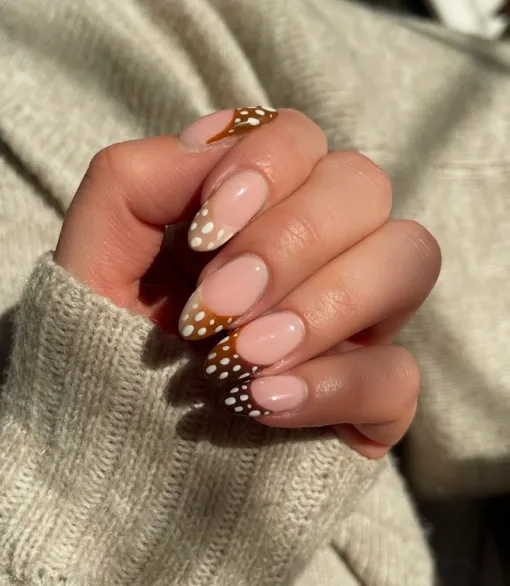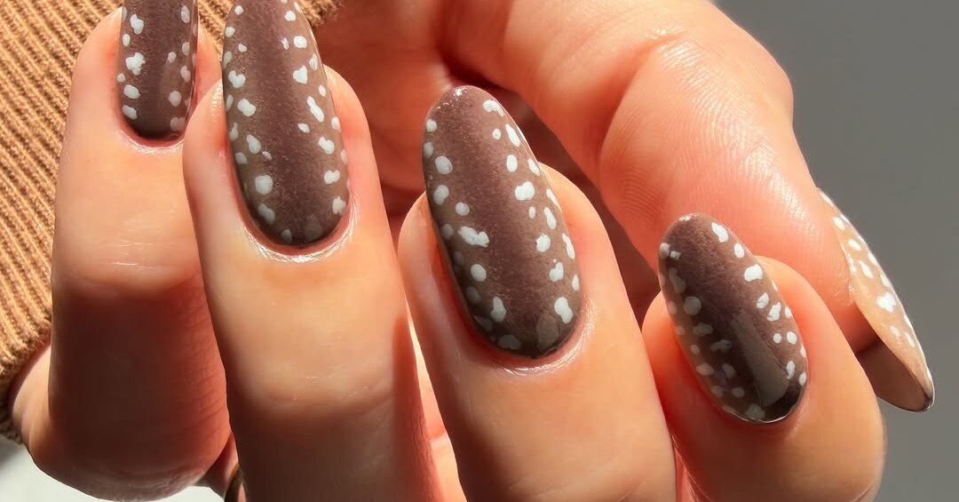 Bambi Nails — редкий вид дизайна, который выигрышно смотрится на короткой и средней длине. Лучше всего выбирать мягкий овал или квадрат, а вот стилеты абсолютно точно не подойдут — форма слишком агрессивная для подобного принта. А еще ногти в стиле «Бэмби» идеально подходят тем, у кого нет времени на регулярную коррекцию — просто сделайте базу в технике омбре (от прозрачного у кутикулы к коричневому). Когда ноготь будет отрастать, граница станет не так заметна, а пятнистый принт отвлечет внимание.