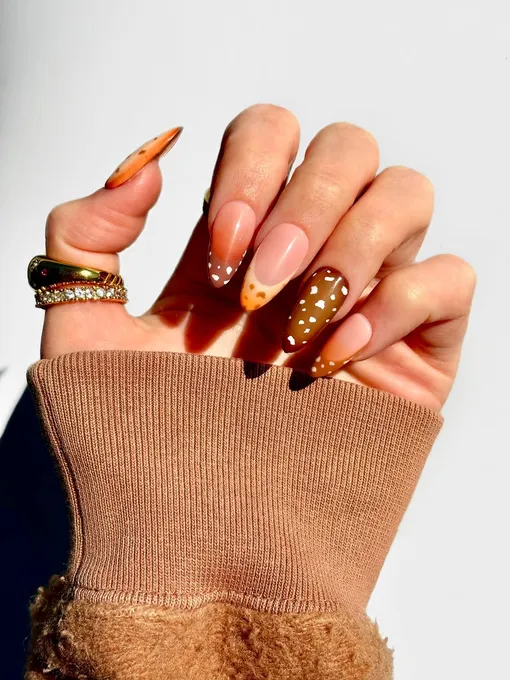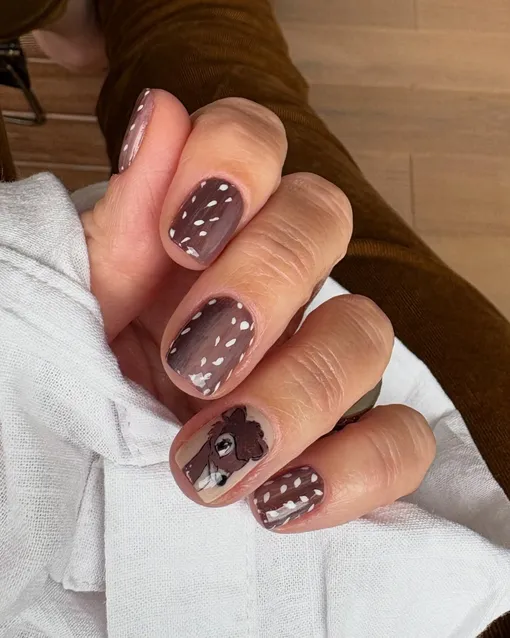 Помните о том, что никто не обязывает вас делать bambi nails на все ногти — можно оставить 2-3 ногтя с этим принтом, а остальные покрыть коричневым или молочным однотоном. Актуальным считается вариант френча с таким принтом, и не забывайте, что в моде mismatched nails — так что принт можно сочетать с другими узорами.