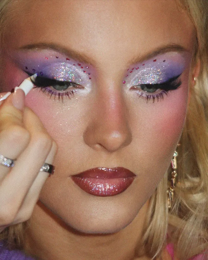 Создать подобный бьюти-образ, который будет уместен в обычной жизни, вполне реально. Начните с качественного увлажнения кожи и нанесите легкое тонирующее средство. Для естественного сияния распределите жидкий хайлайтер по выступающим точкам: на верхние линии скул, под бровями, вдоль переносицы и на дугу Купидона. Кремовые румяна подходящего цвета растушуйте по яблочкам щек, слегка выводя продукт к вискам и затрагивая спинку носа. Веки проще всего оформить одним оттенком теней. Сейчас особенно актуальны пастельные тона: лавандовый, мятный, нежно-розовый. Поверх можно нарисовать тонкую длинную стрелку. Ресницы прокрашивают обильно. Далее четко очертите контур губ карандашом, заполните его любимой помадой и обязательно добавьте слой прозрачного глянцевого блеска или плампера для объема. Если хотите попробовать мейкап с декоративными элементами — обезжирьте кожу в нужной области и с помощью специального клея закрепите стразы. Завершите макияж фиксирующим спреем с эффектом сияния — он сохранит свежесть и безупречный вид бьюти-образа на долгие часы.