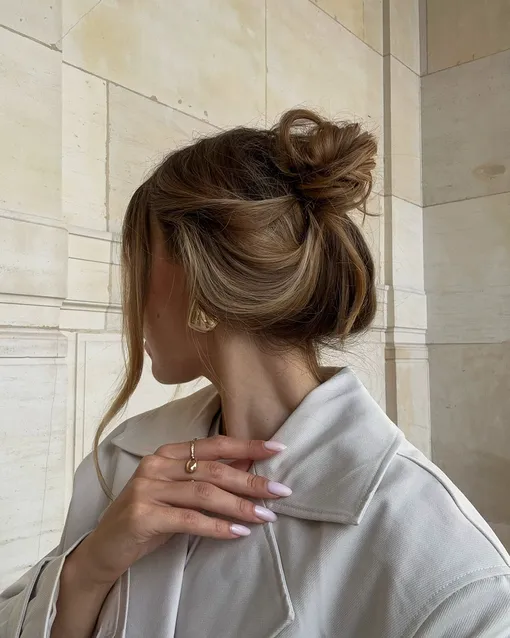 Главный принцип — намеренная небрежность. Пучок может располагаться низко на затылке или высоко на макушке. Куда важнее общее ощущение легкости и подвижности. Следует избегать тугой, идеально гладкой «улитки». Волосы лучше завязать в свободный узел или сформировать мягкую ракушку. Выбивающиеся пряди и торчащие концы здесь будут только в плюс. Хотите добавить нотку элегантности бьюти-образу? Выпустите несколько тонких прядей, пусть они мягко обрамляют лицо.