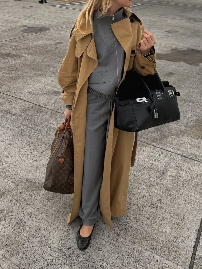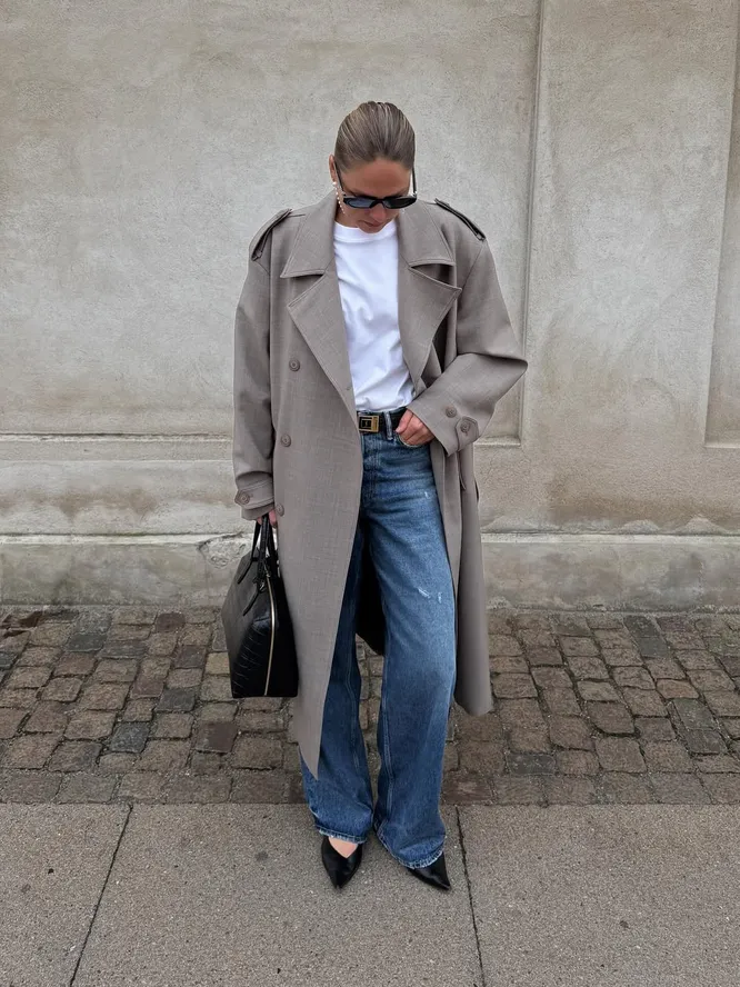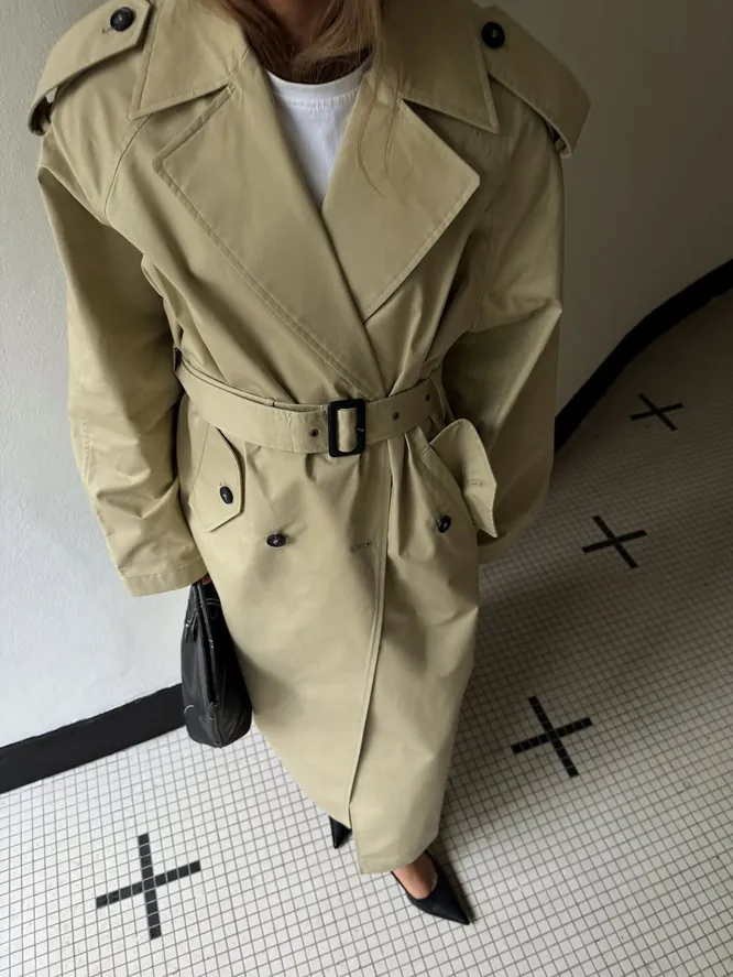 Наконец, детали. Это пояса на талии и хлястики на рукавах, хотя последние уже необязательны. В моде акцентные пуговицы или пряжки, особенно популярны металлические варианты с эффектом патины. А крупные накладные карманы добавляют плащу утилитарности.