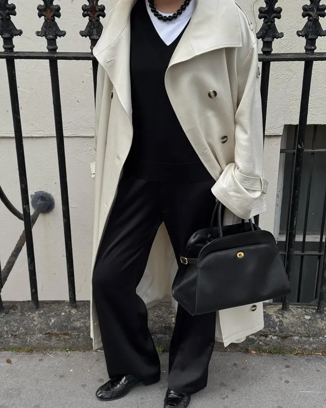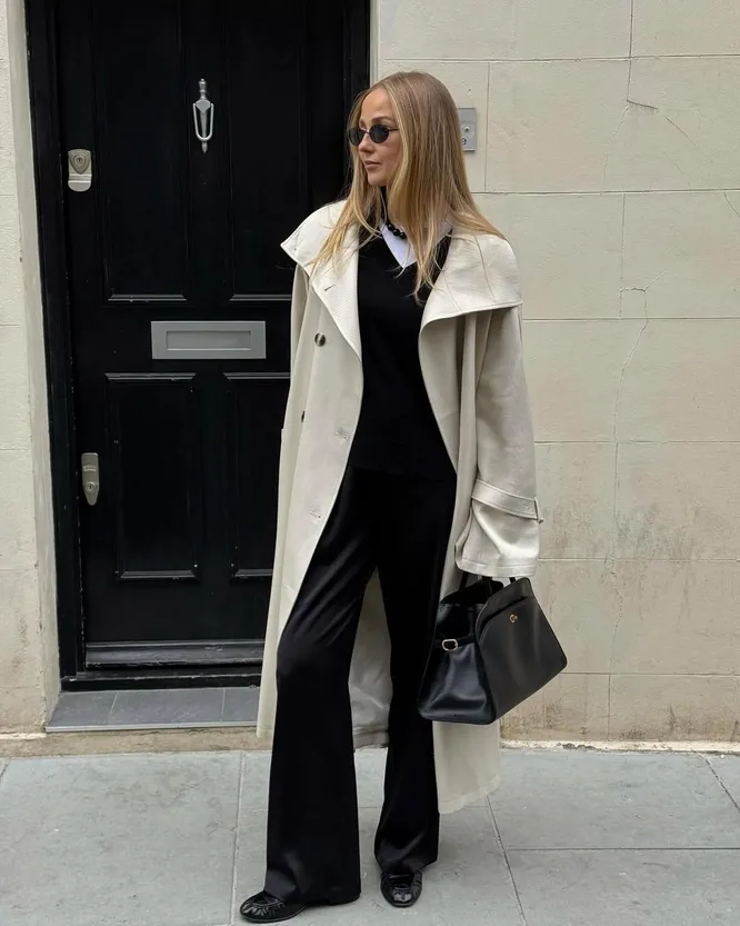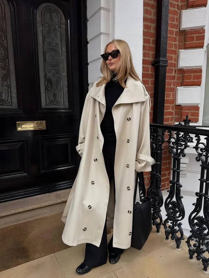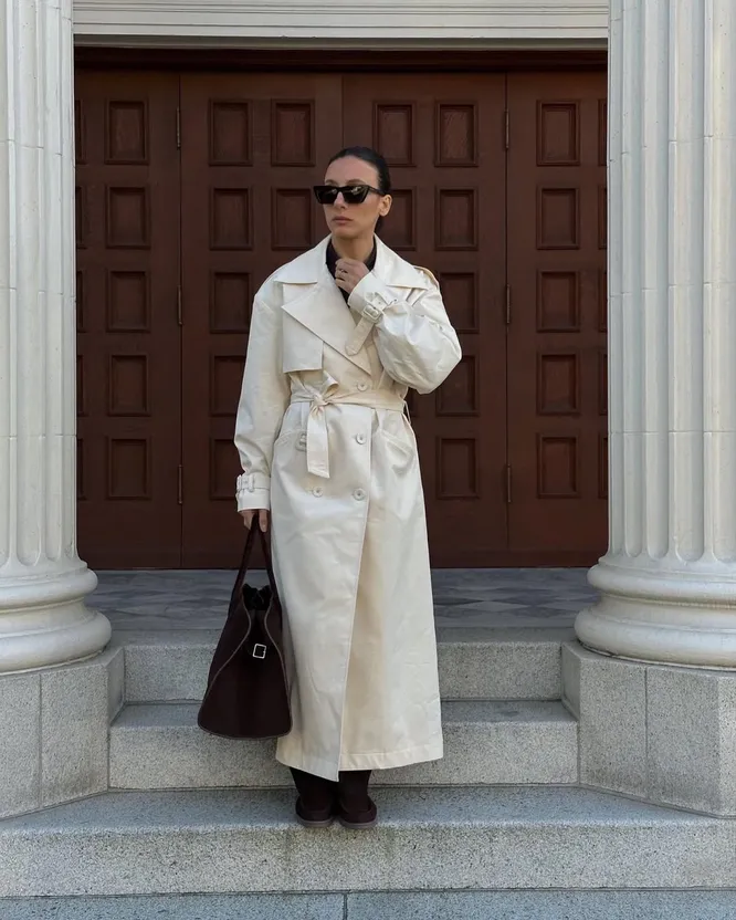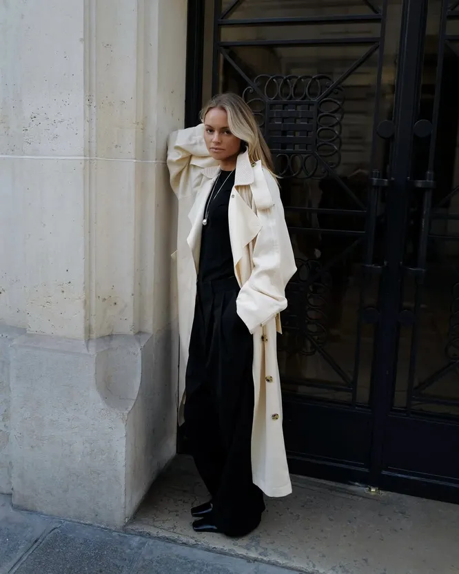 Главное, что нужно знать: актуальный тренч должен быть максимально длинным. Плащи в пол или хотя бы закрывающие икры — бесспорные фавориты. Что касается фасона, здесь четко прослеживаются два популярных решения. Первое — классическая модель прямого кроя. Второй вариант — расклешенный плащ А-силуэта. Он выглядит более расслабленно и скорее напоминает элегантную накидку. Обязательный атрибут обоих — отложной воротник.