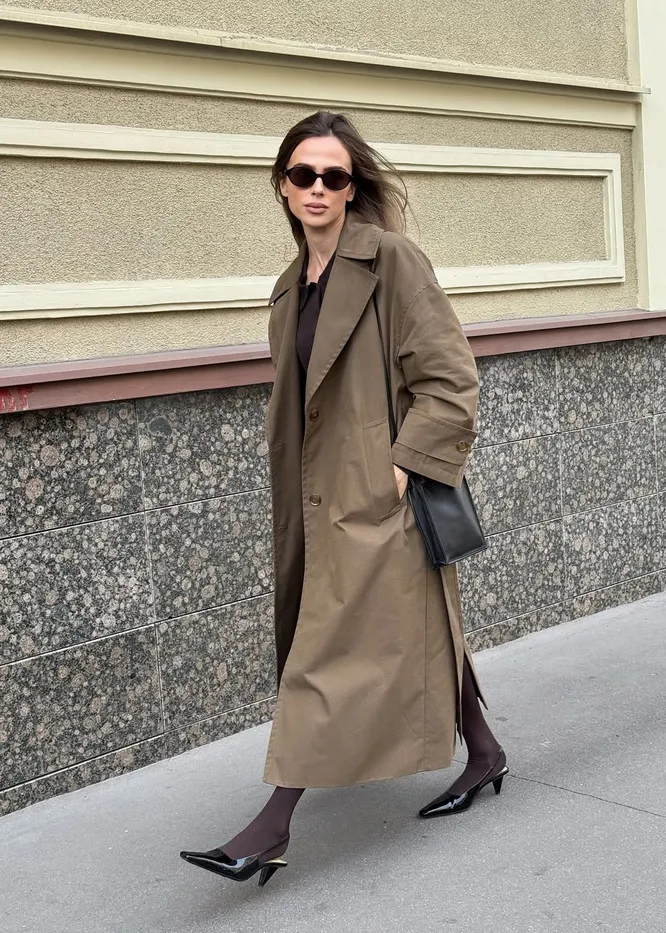 Главное, что нужно знать: актуальный тренч должен быть максимально длинным. Плащи в пол или хотя бы закрывающие икры — бесспорные фавориты. Что касается фасона, здесь четко прослеживаются два популярных решения. Первое — классическая модель прямого кроя. Второй вариант — расклешенный плащ А-силуэта. Он выглядит более расслабленно и скорее напоминает элегантную накидку. Обязательный атрибут обоих — отложной воротник.