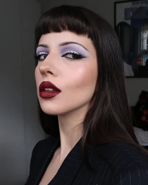 Важная часть этого бьюти-образа — фарфоровая кожа с эффектом свечения изнутри. Для этого не требуется плотный тональный крем — идеально подойдут увлажняющие кушоны. Чтобы усилить мерцание, добавьте немного хайлайтера в основу или предварительно нанесите его на нужные участки. Следующий этап — скульптурирование лица. Выделите темным холодным корректором скулы, лоб, крылья носа и подбородок, а также веки. Это придаст образу драматизма. Для мейка губ выбирайте насыщенные оттенки: винную, бордовую или фиолетовую помаду. Контур можно оформить черным карандашом, а середину заполнить цветом — такой градиент выглядит необычно. Макияж глаз также выполняют в темной гамме: графитовой, шоколадной, черной, сливовой или синей. Актуальны как мерцающие, так и матовые тени. Ресницы тщательно прокрашивают (можно добавить накладные пучки). Этот мейкап перекликается с макияжем Мортиши Аддамс, а если поэкспериментировать и сделать полностью черные губы, то отсылает к гриму участников группы KISS.