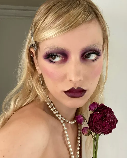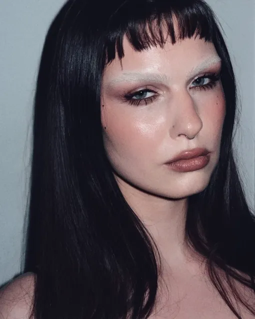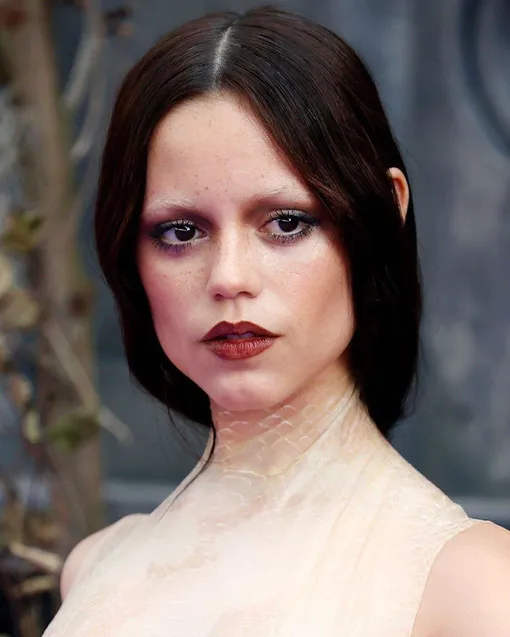 Мы уже рассказывали о том, как собрать аутфиты в этом стиле, какой маникюр точно попадет в эстетику, а теперь настала очередь макияжа. Для его создания необходима ровная фарфоровая кожа. Брови и ресницы высветляют с помощью праймера и белой или бежевой туши, на веки обильно наносят светло-коричневые тени. Скулы обязательно выделяют скульптором, а хайлайтер с мелкодисперсным шиммером наносят на кончик носа и внутренние уголки глаз. Губы оформляют в шоколадной гамме или тонируют консилером, как это было популярно в 2010-х. Такой подход соответствует эстетике Beige Goth. Если высветленные ресницы и брови кажутся слишком смелым шагом, обратите внимание на вариацию, которую мы подсмотрели у Дженны Ортеги. У актрисы во время промотура второго сезона сериала «Уэнсдэй» был темный фиолетовый макияж глаз и губ, который резко контрастировал с фарфоровой кожей.