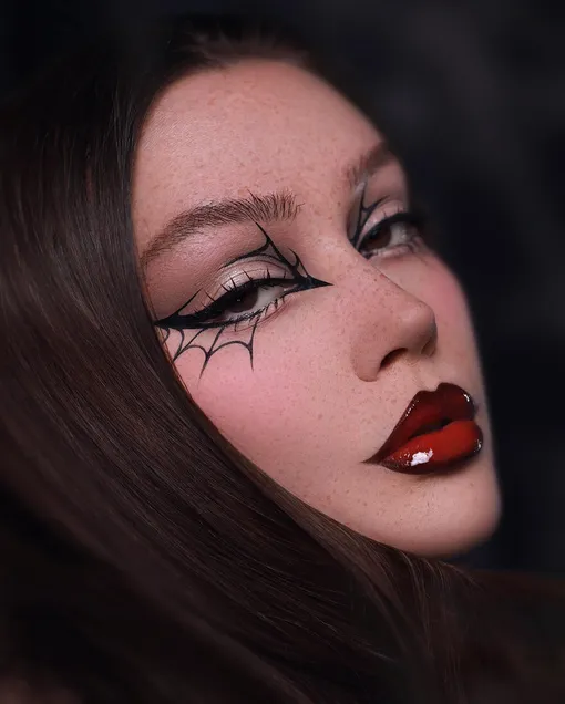Для более точного попадания в хэллоуинскую эстетику тонкой кистью можно вывести узор паутины у внешнего уголка глаза вместо классической стрелки. Еще один способ усилить праздничный образ — эффект tired girl, популярный в интернете. Его легко повторить, нанеся коричневые или фиолетовые тени не только на складку века, но и под глаза, создав иллюзию синяков. Дополните макияж блестками, имитирующими слезы, и выделите скулы, чтобы они казались слегка впалыми, — это напомнит об Эмили из мультфильма «Труп невесты».