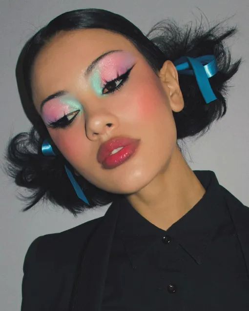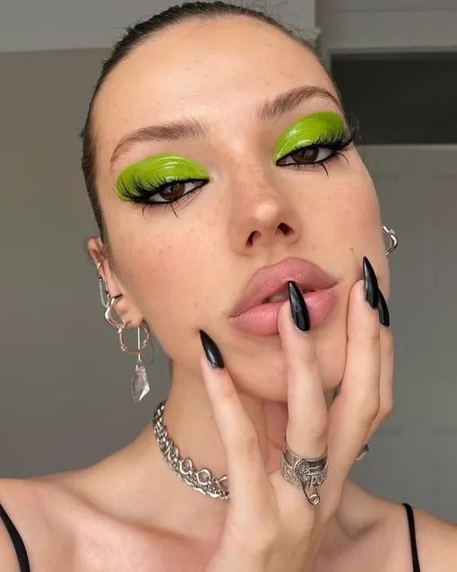 В этом случае тон лучше сделать максимально естественным с помощью BB- или CC-крема. Губы также оставляют нейтральными, увлажнив их маслом или бальзамом. Единственным акцентом становятся глаза. На веки наносят неоновые, яркие оттенки, которые можно смешивать, наслаивать или комбинировать в градиентные переходы, напоминающие радугу. Стрелки также выполняют в ярких цветах и нестандартной формы — закругленными, двойными или фигурными. Самые актуальные варианты оттенков: оранжевый, фуксия, бирюзовый, лимонный. Кстати, сочетание лаймового и фиолетового идеально подойдет для пародии на образ Дафни Блейк из «Скуби-Ду» или станет отсылкой к миру «Битлджуса».
