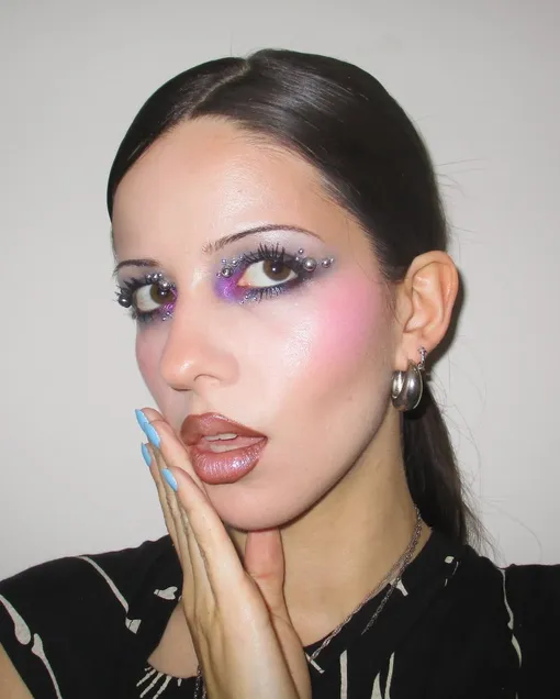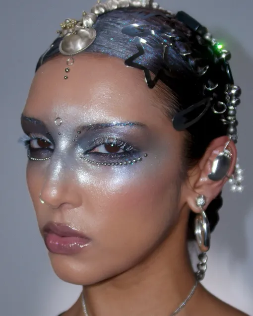 Здесь база строится на минимализме: влажный полупрозрачный тон, аккуратные брови и нейтральные губы. Фокус смещается на глаза и скулы — для их выделения используют кремовые тени и хайлайтер холодных оттенков: серебро, серо-розовый, платиновый или светло-фиолетовый. Эти продукты наносят плотным слоем на веки и мягко растушевывают по направлению к вискам и переносице. Для вечерней версии добавьте несколько страз или жемчужин, которые внесут футуристичные нотки. Такой мейк открывает пространство для фантазии: дополнительно прорисуйте цветные чешуйки для образа русалки или добавьте больше бусин и дуохромные тени в розово-бело-голубой гамме, вдохновляясь внешним видом Перлов из фильма «Валериан и город тысячи планет». А если покрыть шиммером все лицо, получится кожа, как у Эдварда Каллена в «Сумерках».