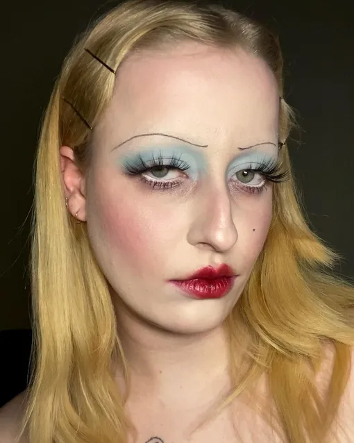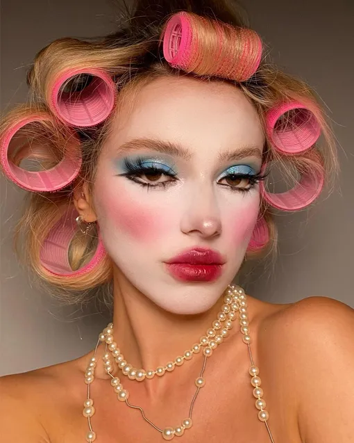 Акцент в этом бьюти-образе делают на ресницы и румянец. Чаще всего добавляют накладные пучки разной длины или тщательно прокрашивают ресницы тушью в несколько слоев, чтобы добиться эффекта «паучьих лапок». Румяна щедро наносят на яблочки щек, скулы, лоб и переносицу. Можно использовать технику дрейпинг или другие популярные приемы, о которых мы писали здесь. Губы красят нежно-розовой или ягодной помадой. Контур либо растушевывают для эффекта зацелованных губ, либо наносят цвет посередине, оставляя края светлыми, чтобы создать ассоциации с макияжем гейш. Тон при этом должен быть светлым, но не чрезмерно, чтобы не было ощущения «маски».