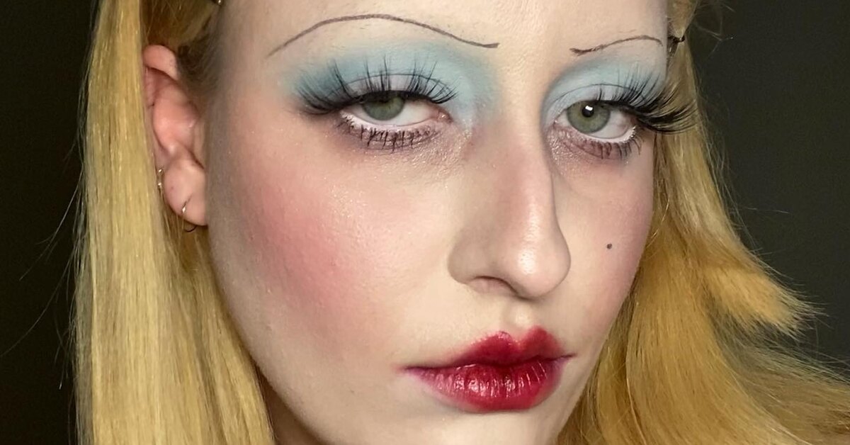 Акцент в этом бьюти-образе делают на ресницы и румянец. Чаще всего добавляют накладные пучки разной длины или тщательно прокрашивают ресницы тушью в несколько слоев, чтобы добиться эффекта «паучьих лапок». Румяна щедро наносят на яблочки щек, скулы, лоб и переносицу. Можно использовать технику дрейпинг или другие популярные приемы, о которых мы писали здесь. Губы красят нежно-розовой или ягодной помадой. Контур либо растушевывают для эффекта зацелованных губ, либо наносят цвет посередине, оставляя края светлыми, чтобы создать ассоциации с макияжем гейш. Тон при этом должен быть светлым, но не чрезмерно, чтобы не было ощущения «маски».