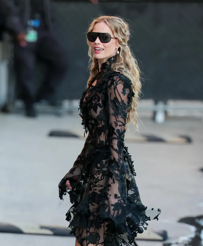 К слову, такая прическа идеально перекликается с настроением мрачной романтики фильма «Грозовой перевал», ради которого Марго Робби и отправилась на шоу Джимми Киммела — весь ее образ, от полупрозрачного кружевного платья Alexander McQueen с короткой юбкой и рукавами-колоколами до такой вот текстурированной укладки в сочетании с «мальвинкой» — просто идеальное воплощение мрачной романтики.