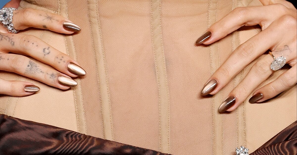 В начале сентября мы обратили внимание на то, что наиболее актуальными были нежные варианты нейл-дизайна — доказательством тому служил тренд на «стеклянные ногти». Но Хейли Бибер изменила правила игры. Для недавнего Гала-вечера Музея Академии Зола Ганзориг сделала своей клиентке «вельветовые ногти», а заодно вернула в моду «кошачий глаз». Зола выбрала идеальный оттенок коричневого, который сильнее всего ассоциируется с осенней порой.