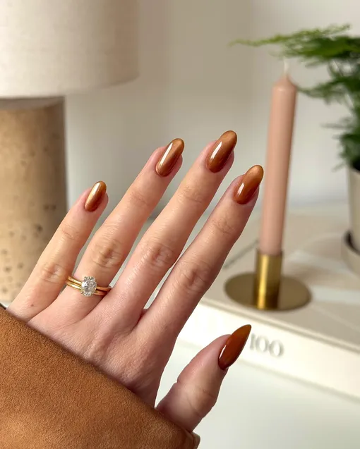 Блестящий, экстравагантный и, безусловно, носибельный маникюр, идеально подходит для нынешней погоды и навевает воспоминания о теплом какао, горячем шоколаде или кофе — зависит от вашего любимого напитка. Еще одно преимущество подобного оттенка — он идеально сочетается с замшей.