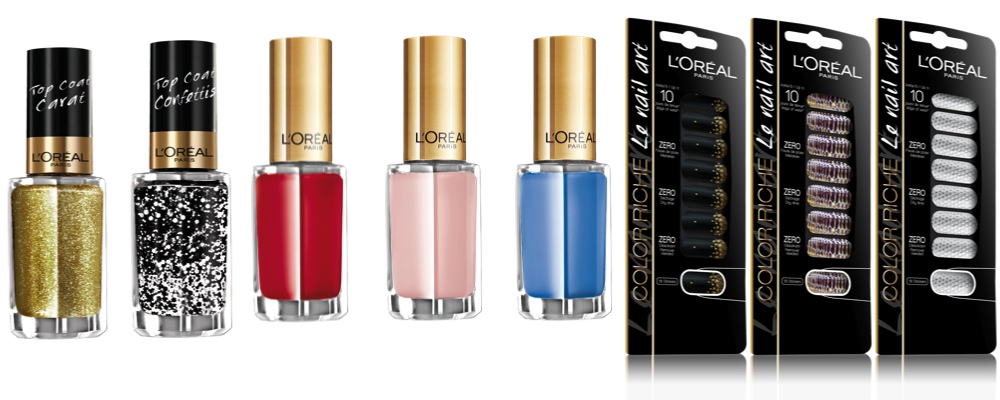 1/ Верхнее покрытие Top Coat, 910, Gold Carat, 179 руб. 2/ Верхнее покрытие Top Coat, 916, Confettis, 179 руб. 3/ Лак, 401, Rouge Pin Up, 149 руб. 4/ Лак, 101, Opera Ballerina, 149 руб. 5/ Лак, 611, Sky Fits Heaven, 149 руб. 6/ Cтикеры Le Nail Art, 009, Gold Dust, 259 руб. 7/ Стикеры Le Nail Art, 013, Diamant Eternal, 259 руб. 8/ Стикеры Le Nail Art, 006, Python Chic, 259 руб. Все Color Riche, L’Oréal Paris