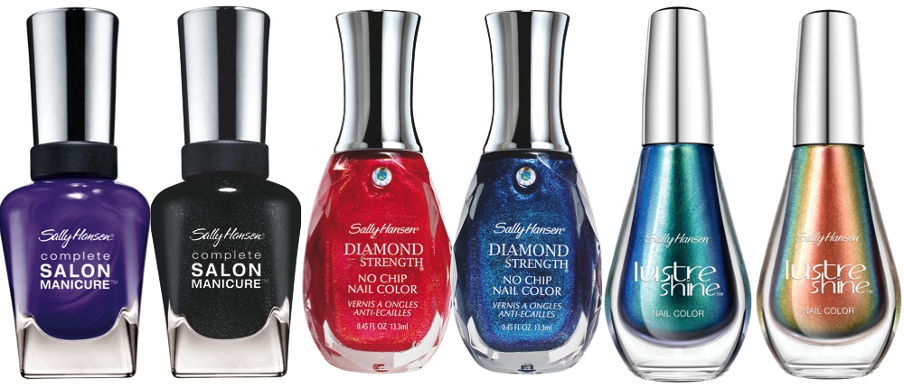 1/ Complete Salon Manicure, 470, Purple Pulse, 319 руб.; 2/ Complete Salon Manicure, 670, Midnight in NY, 319 руб.; 3/ Complete Salon Aurora, 260, Ruby Ring, 279 руб.; 4/ Complete Salon Aurora, 270, Tender Teal, 279 руб. ; 5/ Lustre Shine, 007, Scarab, 279 руб. 6/ Lustre Shine, 003, Firefly, 279 руб. Все Sally Hansen ;