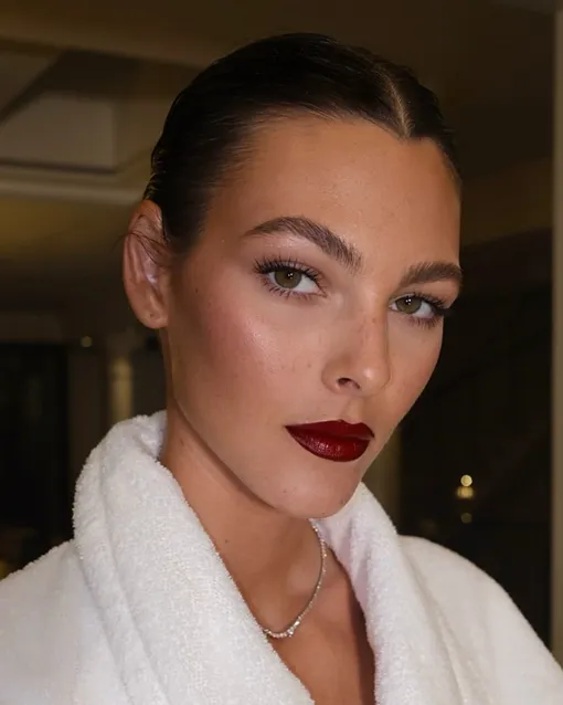 Популярность глубоких, почти черных бордовых и сливовых оттенков связана с трендом на вамп-романтику, о которой мы подробно писали здесь. Этот стиль, популярный в соцсетях, сочетает драматичную чувственность с романтичными деталями, отсылая к образам героинь старых готических произведений. Очень темная помада добавляет бьюти-образу загадочности и легкой мрачности. Важно, что в моде все же не оттенки черного — в мейке губ должны без труда угадываться ягодные или красноватые ноты. Кстати, если вы не готовы к покупке такого продукта, есть альтернатива. Обведите контур губ черным карандашом для глаз и растушуйте линии по направлению к центру. Сверху нанесите привычную бордовую или винную помаду.