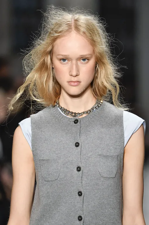 Тренд на осознанную небрежность нашел яркое отражение и на миланских подиумах. Для показов N21, Sportmax и Bach Mai стилисты намеренно оставили волосы моделей без пристального внимания. По подиуму шли манекенщицы с хвостами с выбивающимися прядями, заправленными за воротник, или же с растрепанными волосами, которые, честно говоря, даже хотелось слегка пригладить. Эта эстетика перекликается с популярной философией tired girl — образом уставшей, но прекрасной героини, которая не тратит часы на стояние перед зеркалом, а занята по-настоящему важными делами. Создать такую укладку проще простого: нанесите на слегка влажные волосы спрей с морской солью, а затем высушите их, активно перебирая пальцами и направляя поток воздуха снизу вверх для легкого объема. Результат можно закрепить текстурирующей пудрой или спреем. Отдельные пряди у лица стоит слегка проработать плойкой, чтобы задать направление и добиться легкого «залома» — будто вы весь день заправляли их за ухо. Однако важно не переусердствовать и остановиться в тот момент, когда прическа еще выглядит ухоженной, а не просто неопрятной. Это, кстати, прямое продолжение модного тренда depression hairstyles.