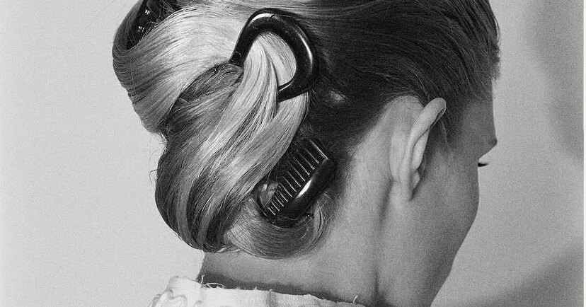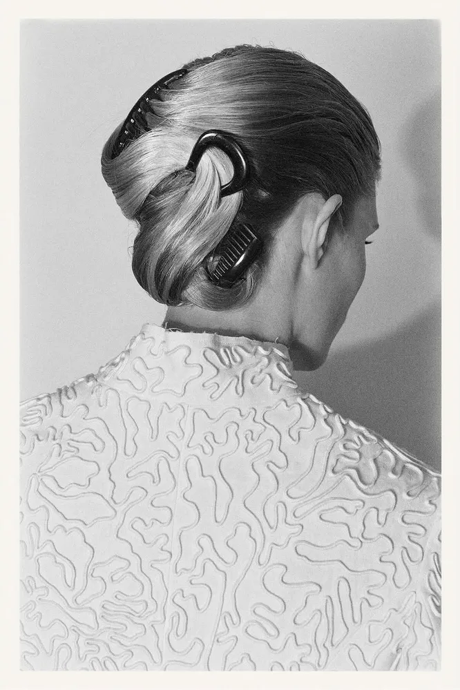 Ключевой и самый необходимый аксессуар — гребень. Он не только удерживает волосы, но и становится органичной частью лука. Для гладких и прямых прядей подойдут гребни с частыми зубьями. Обладательницам густых и вьющихся локонов лучше выбрать модели с более редкими. Важно, чтобы кончики зубцов были закругленными — это обеспечит комфорт и защитит шевелюру и кожу головы от повреждений. При покупке декоративного гребня обратите внимание на варианты из матового золота, палладия, дерева или пластика. Основной критерий — нейтральная темная палитра с состаренным эффектом, что придаст образу винтажные ноты. Дополнительно можно использовать несколько шпилек, если волосы длинные и тяжелые. Пригодится и популярная французская U-образная заколка: ее комбинируют с гребнем для более интересного результата, как у моделей из лукбука. Также потребуется гель, матовая паста или восковой стик, чтобы укротить непослушные пряди. И для закрепления укладки — лак с легкой фиксацией.