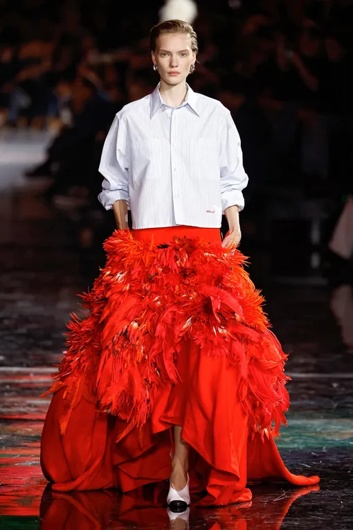 Еще с летней Недели высокой моды не могу перестать думать о «лобстерном» красном макси из кутюрной коллекции Schiaparelli. Модель-годе с открытыми плечами — мой личный фаворит. К тому же благодаря сияющим высоким перчаткам, которые дополняли макси на показе, образ идеально вписывается в актуальную оперную эстетику, которая станет главным трендом 2026-го.