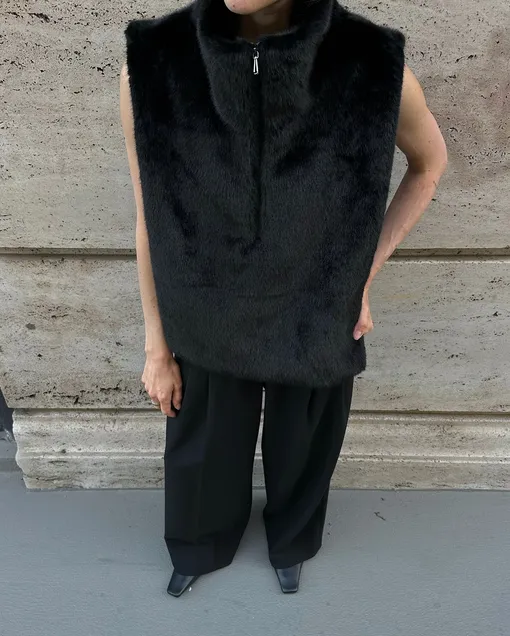 Еще один тренд сезона — меховые манишки. Самые актуальные варианты напоминают жилеты с высоким горлом: они заканчиваются в районе верхней точки тазовой кости. При выборе важно, чтобы мех выглядел натуральным. Особенно актуальны шоколадные и кремовые изделия. Инфлюенсеры надевают такие манишки и под верхнюю одежду для выхода на улицу, и как второй слой, например, на лонгслив, внутри помещения. Кстати, особенно эффектно эти изделия смотрятся, дополненные тонкими кожаными ремнями.