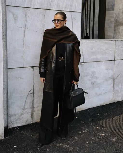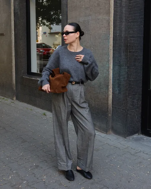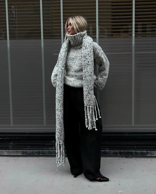 Ни один осенне-зимний образ не обходится без акцентов, и трикотажные аксессуары здесь выходят на первый план. Широкий шарф не только защитит в ветреную погоду, но и с успехом заменит высокий воротник. Практичный и стильный прием — подобрать шарф в тон свитеру или верхней одежде, чтобы собрать комплект в единое целое. Избегайте изделий с люрексом и прочими декоративными элементами — шарф должен гармонировать с большинством ваших аутфитов. Гетры утепляют щиколотку и помогают сохранить баланс в образе с балетками или лоферами. Отдавайте предпочтение моделям без выраженного ворса, они должны сидеть свободно и мягко драпироваться на ноге. Цвета для обоих аксессуаров могут быть как нейтральными, так и насыщенными — при условии, что они сочетаются с остальными элементами образа.