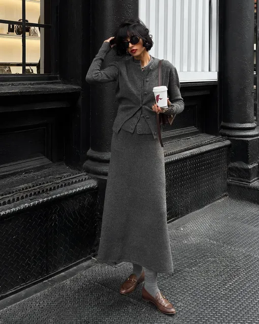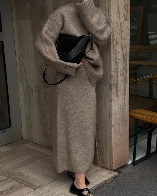 Трикотажный костюм, состоящий из джемпера или кардигана и юбки-миди или макси, — одна из самых выигрышных инвестиций в сезоне. Такой ансамбль сам по себе — законченный аутфит, а его части можно легко комбинировать с другими вещами из гардероба. Для офиса костюм можно дополнить рубашкой и пиджаком в стиле оверсайз, создав утепленный и стильный лук, а для повседневной носки оставить как есть, дополнив лишь аксессуарами. Чтобы вещь служила долго, обратите внимание на модели из кашемира, мериноса, плотной вискозы или шерсти с добавлением эластана — смесовые материалы меньше мнутся и отлично сохраняют форму. Варианты из чистого полиэстера лучше не рассматривать: после нескольких стирок они теряют вид и растягиваются. Цветовая гамма, как и в предыдущих случаях, может быть практически любой, но здесь особенно выигрышно смотрятся нейтральные оттенки. Костюмы бежевого, песочного, серого, шоколадного и черного цвета будут легко сочетаться со многими другими вещами из вашего гардероба.